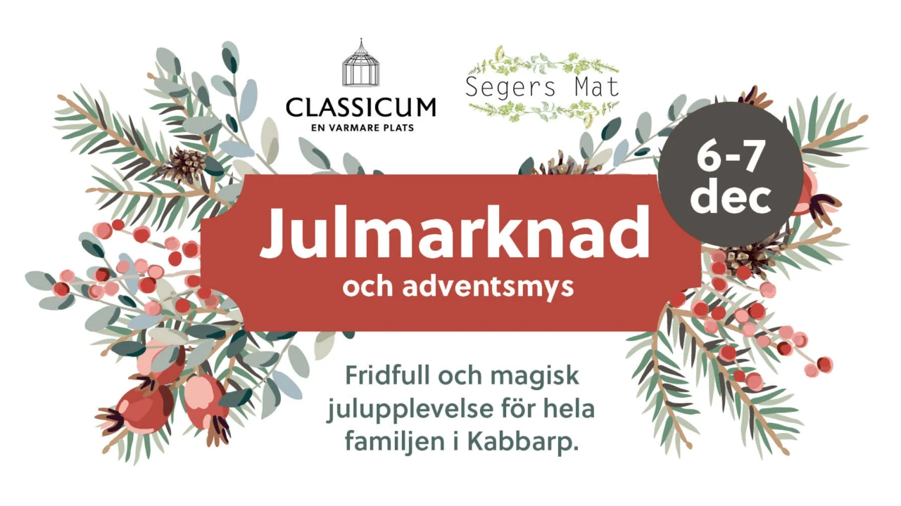 Välkommen till en magisk julmarknad för hela familjen hos Classicum & Segers Mat i Kabbarp. Här väntar julstämning med noga utvalt hantverk, lokalt mathantverk, stämningsfull musik och julens dofter. Restaurangen Segers Mat håller öppet med mat och dryck för både besökare och utställare. En genuin och varm julupplevelse med fokus på kvalitet och atmosfär.