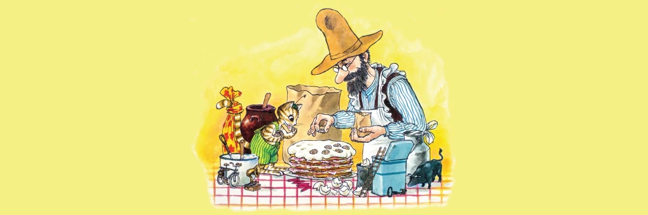 Men det är lättare sagt än gjort. När Pettson ska börja baka upptäcker han att mjölet är slut. Han tänker cykla till affären, men då visar det sig att cykeln har punktering… och snart är de båda indragna i ett charmigt kaos där ingenting går som planerat. Det blir ett ofrivilligt besök i brunnen, ett möte med både grannen Gustafsson och en förrymd tjur och en hel korg med ägg som inte alls hamnar där den ska.