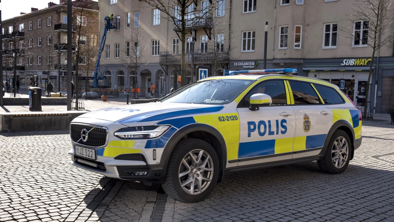 Vi får fint besök av polisen som läser en saga för oss i sagorummet. Efteråt går vi ut och tittar på polisbilen.
