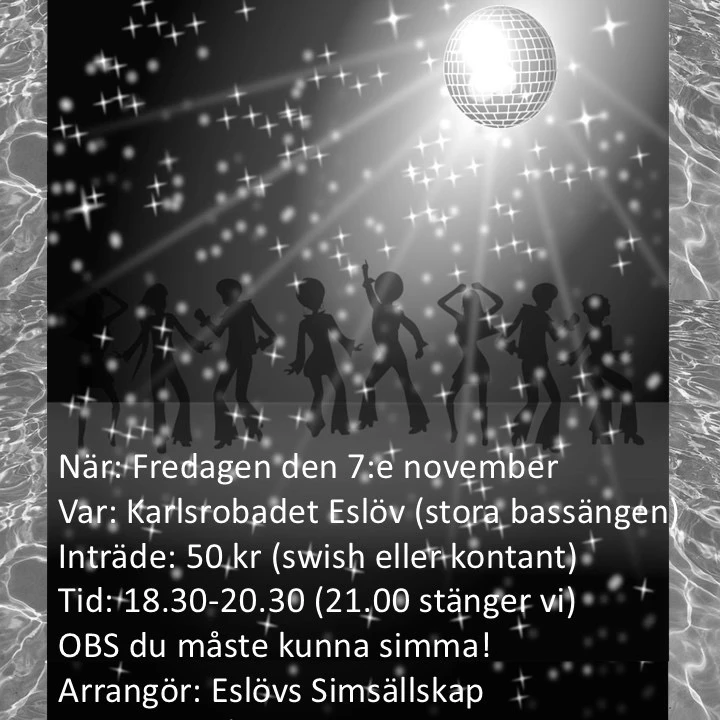 Vattendisco 7/11 på Karlsrobadet för dig som går i årskurs 4-6. Tid: 18.30-20.30. Inträde: 50kr. Det finns kiosk på plats. Betalning via swish eller kontant. Obs! Du måste vara simkunnig. Välkomna önskar Eslövs Simsällskap.